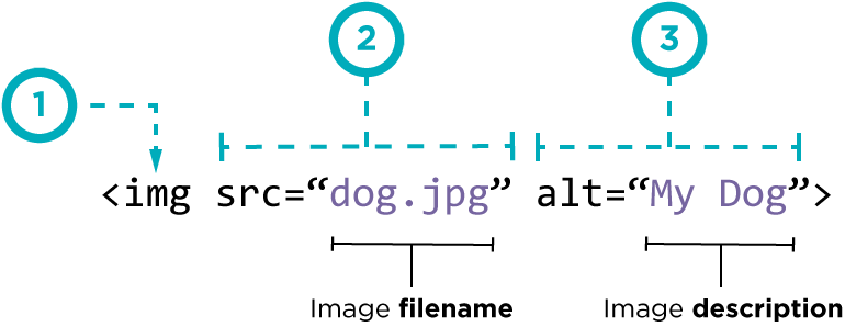 we use element ; that mean there is not close tage . and two attributes scr this to tell where the image find and alt to give description of the image if you cannot see it.