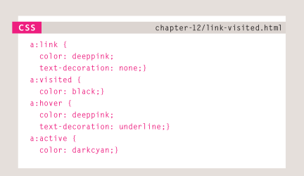 text-indent , text-shadow The value of this property is quite complicated because it can take three lengths and a color for the drop shadow.:first-letter, :first-line Technically these are not properties. They are known as pseudo-elements.STyling linkS :link, :visited reSponding To uSerS :hover, :active, :focus