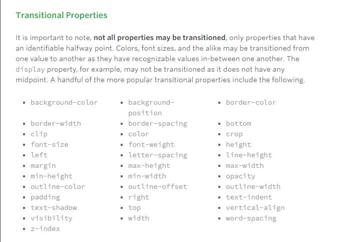 The transition-property property determines exactly what properties will be altered in conjunction with the other transitional properties. By default, all of the properties within an element’s different states will be altered upon change. However, only the properties identified within the transition-property value will be affected by any transitions.